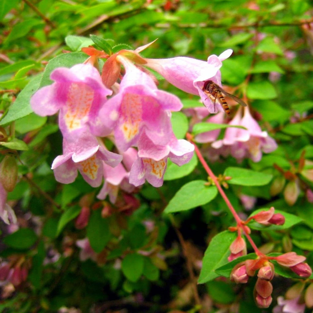 L’Abelia parviflora (synonymes schumannii ou longituba) ‘Bumble Bee’ est une belle obtention horticole européenne aux origines un peu obscures. Comme tous les Abelia, mais aussi les chèvrefeuilles et le Kolkwitzia amabilis, il appartient à la famille des Caprifoliacées. Le port de cet arbuste est à la fois buissonnant et légèrement étalé, porté par des rameaux souples de couleur rougeâtre. Sa croissance est assez rapide, en fonction des conditions de culture. A maturité, après 5 à 10 ans, cet abélia atteindra en moyenne 1.50 m en tous sens, sa ramure ayant tendance à s’étendre avec le temps. La floraison a lieu de juillet à septembre, plus ou moins tôt selon le climat, sur les rameaux âgés de un an et plus. Les boutons d’un rouge un peu rose éclosent en petites fleurs campanulées, larges de 1.5 cm, groupées en panicules à l’aisselle des feuilles. L’intérieur de la corolle est d’un rose mauve vif, la gorge est tachetée de jaune-orangé sur fond blanc, tandis que le revers est teinté de rose lilas pâle. Les calices rougeâtres des fleurs persistent sur les rameaux jusque tard en saison, bien après que les fleurs aient fané. Cette floraison dégage un parfum subtil et agréable, qui attire de nombreux insectes pollinisateurs. La ramure de l’abélie Bumble Bee porte des petites feuilles pointues de couleur vert franc, luisantes, opposées par paires. Elles prennent de jolies teintes rouge-orangé en automne et persistent jusqu’en début d »hiver, dès lors que les gelées ne sont pas trop sévères. Notons que cet abélia chinois préfère les sols restant un peu frais, humifères. Il résistera au froid, jusqu’à -12 ou -15°C en pointe une fois adulte.