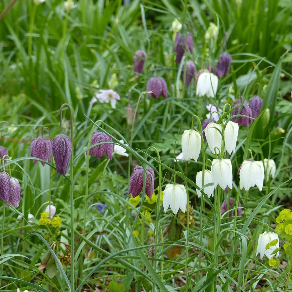 La Collection Fritillaire pintade en pourpre et blanc est une bien jolie façon de fleurir dès le début du printemps les endroits toujours un peu humides du jardin. Ces plantes bulbeuses offrent une floraison originale, en grosses clochettes penchées, à damier pourpré pour la forme classique, ou bien d’un blanc pur pour la forme Alba. Dans la nature, on trouve l’espèce sauvage parfois dans les prairies humides au printemps, ou sous les arbres caducs. C’est ainsi qu’il convient de planter les bulbes, ils se naturaliseront facilement, fleurissant de plus en plus chaque printemps.