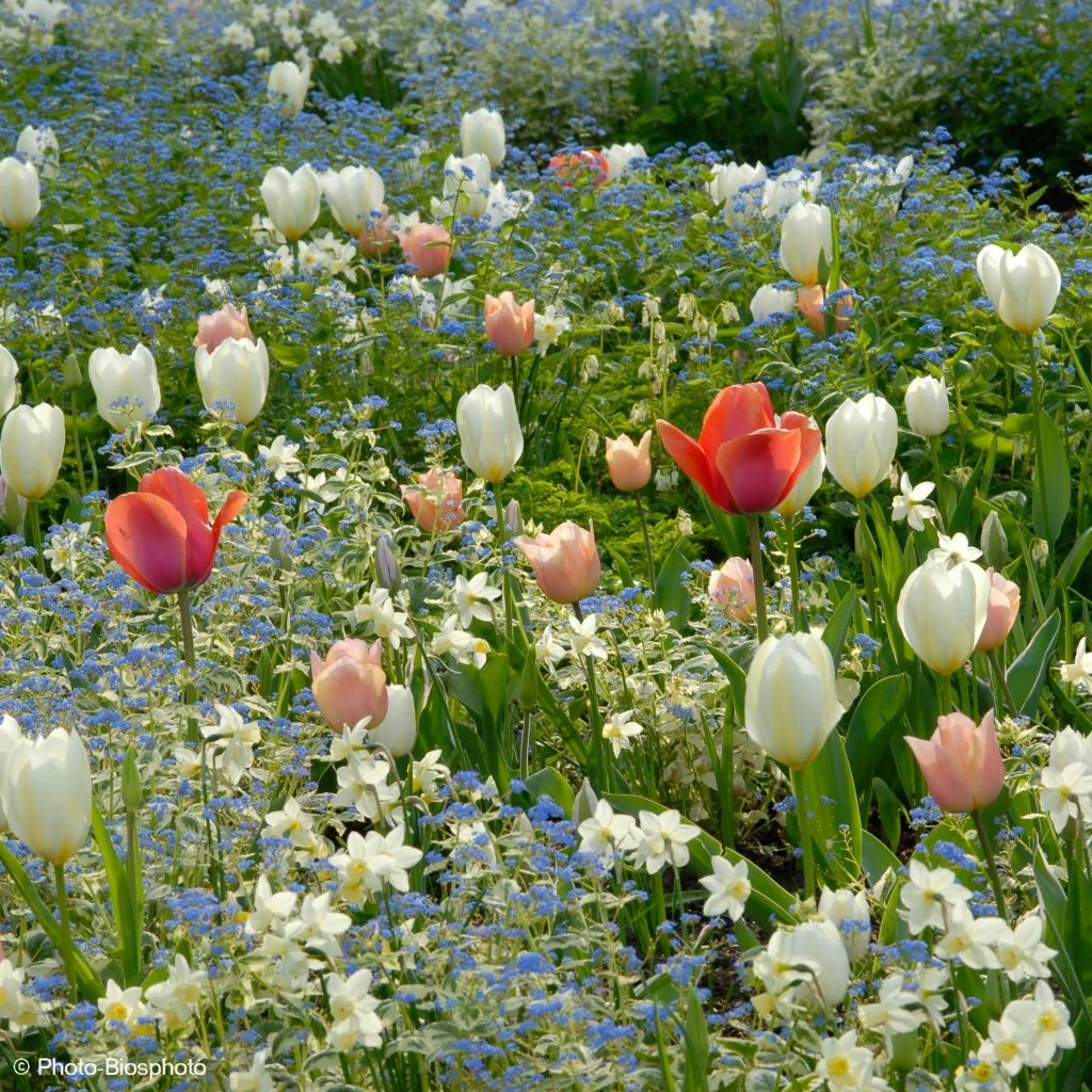 Avec cette collection, tout est dans l’harmonie et la délicatesse ! Les tulipes offrent au regard leurs coupes élégantes parées de blanc, de rose saumoné et d’abricot tendre parmi lesquelles émergeront en bouquets dansants les petites fleurs presque blanches et parfumées du Narcisse. L’ensemble permet de composer sans difficulté un décor inoubliable pour fêter en beauté l’arrivée du printemps. Sublime avec des myosotis bleus ou blancs.
