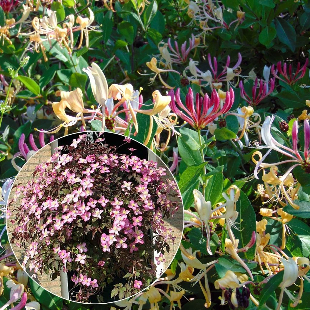 Un duo printanier gagnant ! Les fleurs vivement colorées du Chèvrefeuille ‘Gold Flame’ s’entremêlent aux belles inflorescences rose tendre de la Clématite ‘Mayleen’, sur un fond de feuillage vert et bronze abondant. Toutes deux récompensées par le prestigieux RHS Award of Garden Merit, ces vigoureuses grimpantes volubiles seront irrésistibles, que ce soit par leurs parfums envoutants ou par la véritable force de vie qu’elles arborent du printemps jusqu’à l’automne. Tout est dans l’harmonie du contraste : les couleurs, les formes si distinctes du feuillage et des fleurs… Les longues tiges de ces deux variétés s’enrouleront sur tout support mis à leur disposition. Elles couvriront avec enthousiasme une pergola, une tonnelle, ou partiront à l’assaut d’une vieille haie un peu triste…