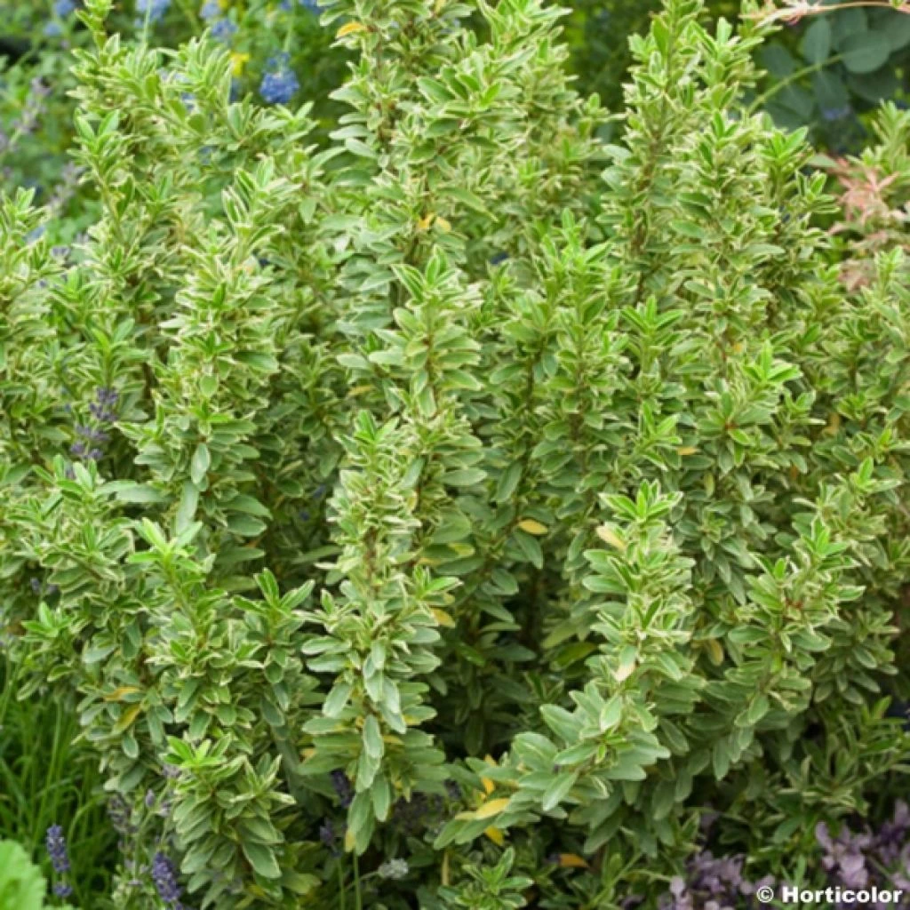 L’Euonymus japonicus Microphyllus Albovariegatus est une ravissante variété de fusain du Japon, de petite taille mais bien buissonnante, dont le menu feuillage luisant, vert marginé de blanc, ressemble à celui du buis panaché. Lumineux et décoratif tout au long de l’année, cet arbuste permet de composer un décor élégant, dans une petite haie ou dans un bac sur la terrasse. Excellente alternative au buis dans les zones mi-ombragées du jardin, supportant bien la taille, cet arbuste préfère toutefois la mi-ombre et les sols frais, y compris à tendance calcaire.